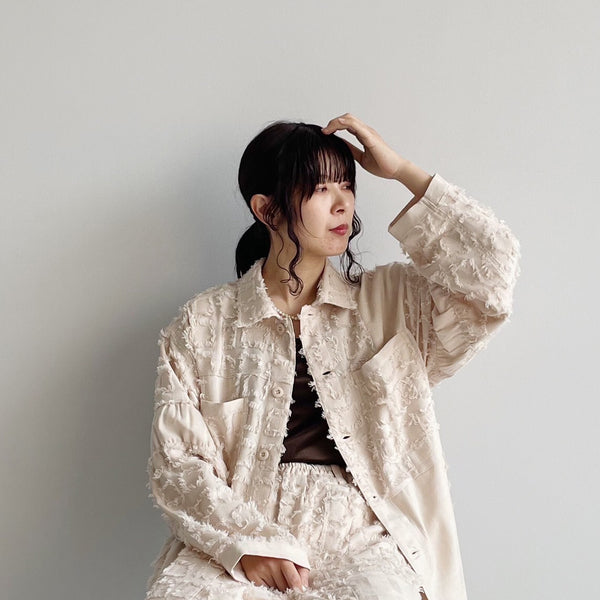 | サイズ | F(身幅:61cm 着丈:47cm 肩幅:58cm 袖丈:50.5cm 袖口幅:18cm 裄丈:79.5cm アームホール:58cm) |