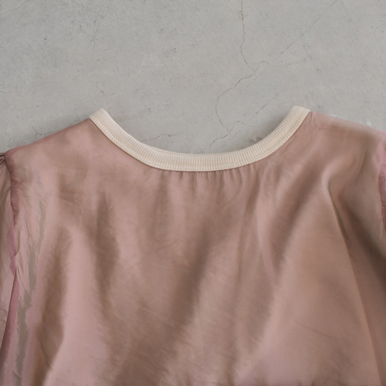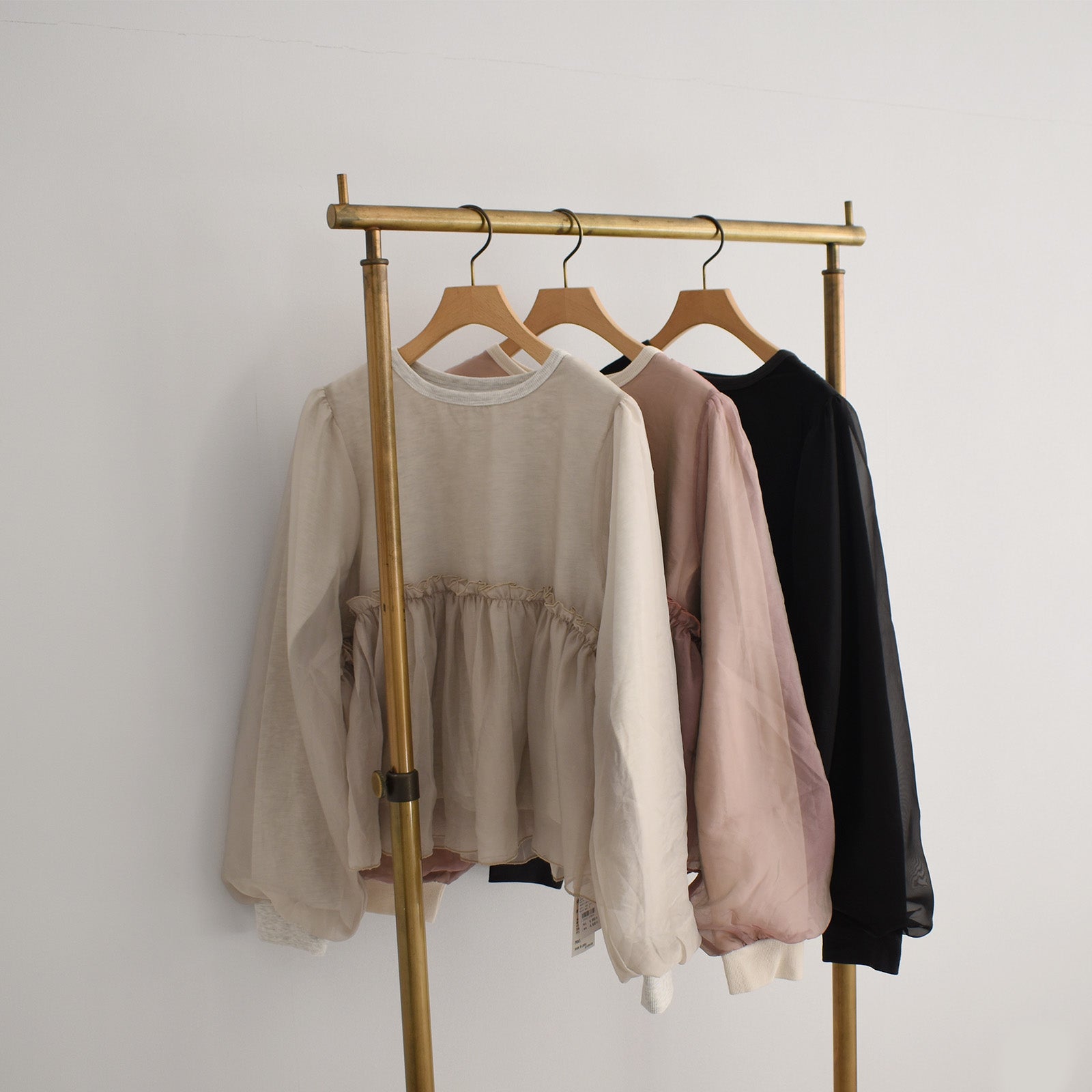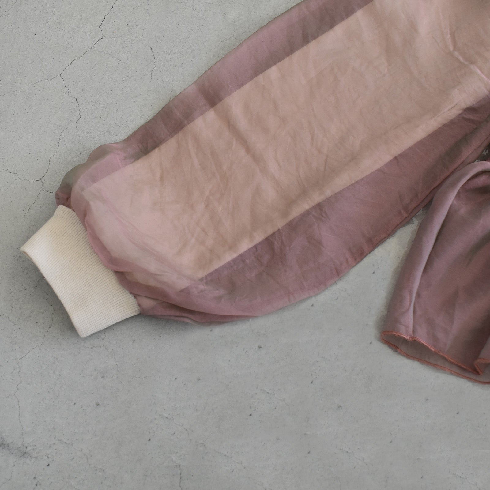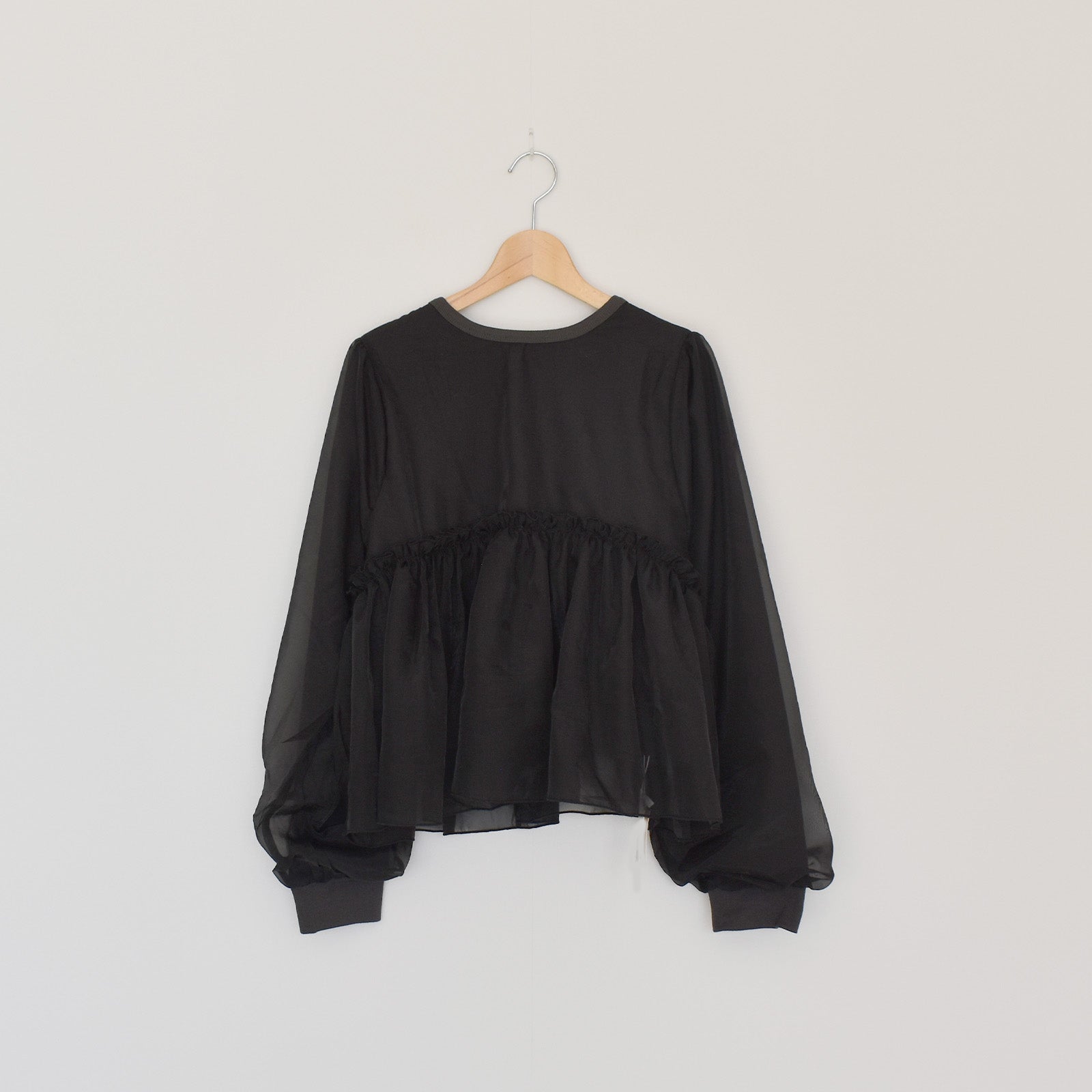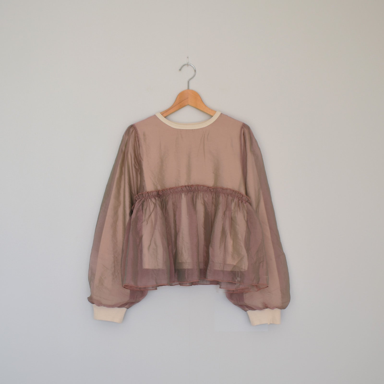 ゆったりとした身幅とオーガンジー重ねたボリューム袖が