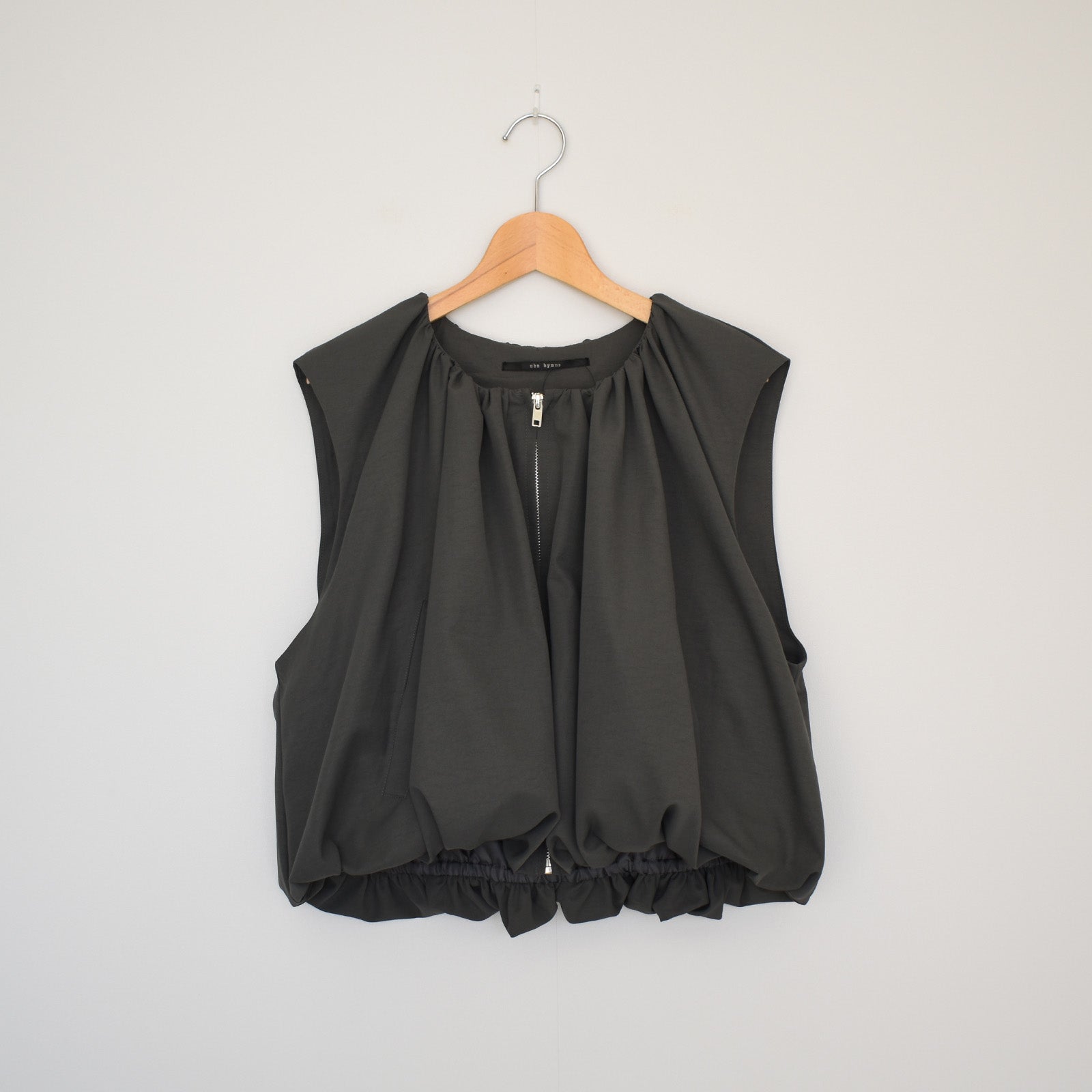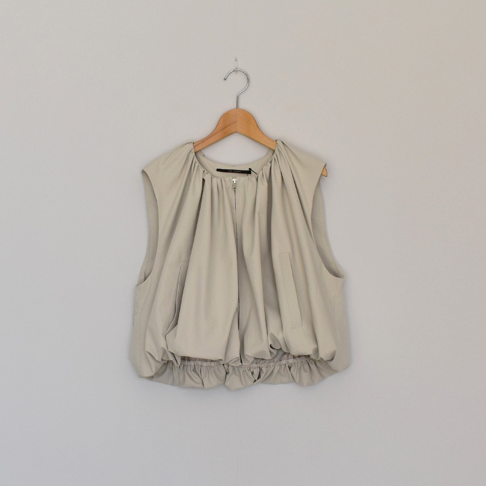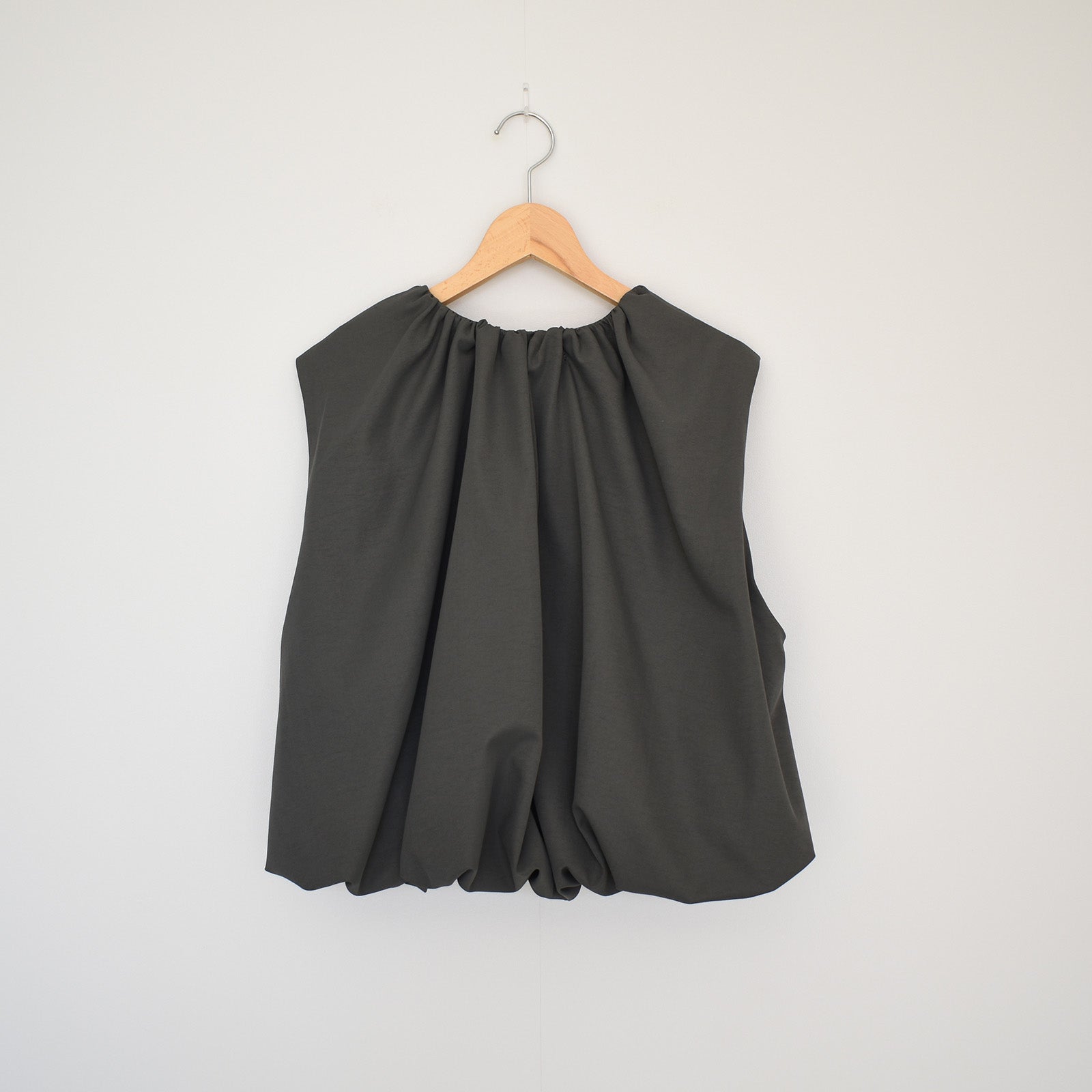 首元にギャザーを施し、裾にかけてふんわりと立体感が出るシルエットのベスト。