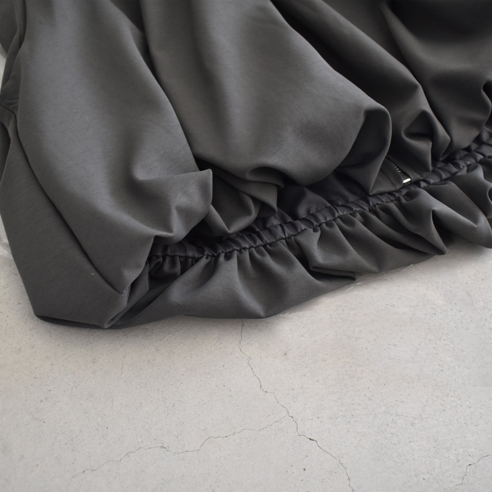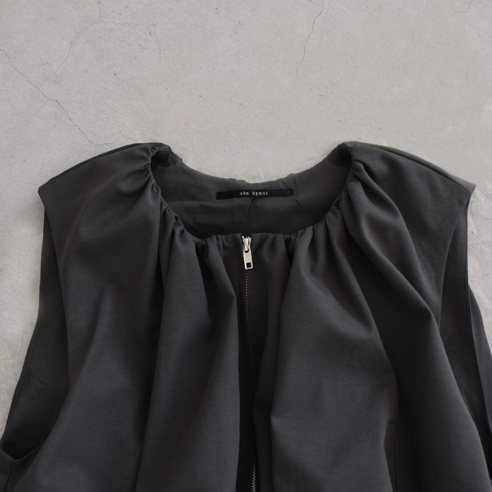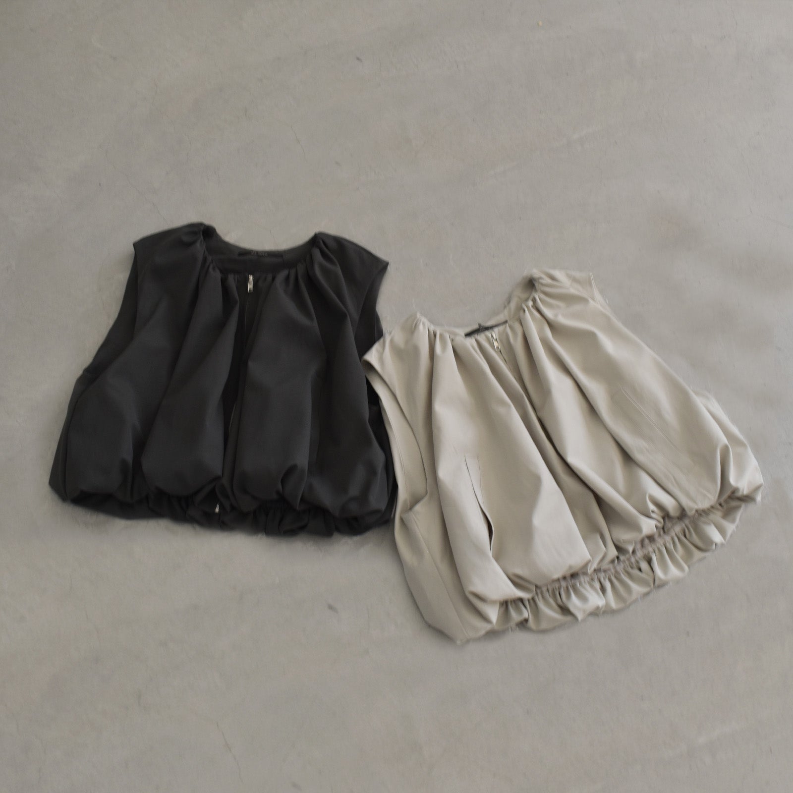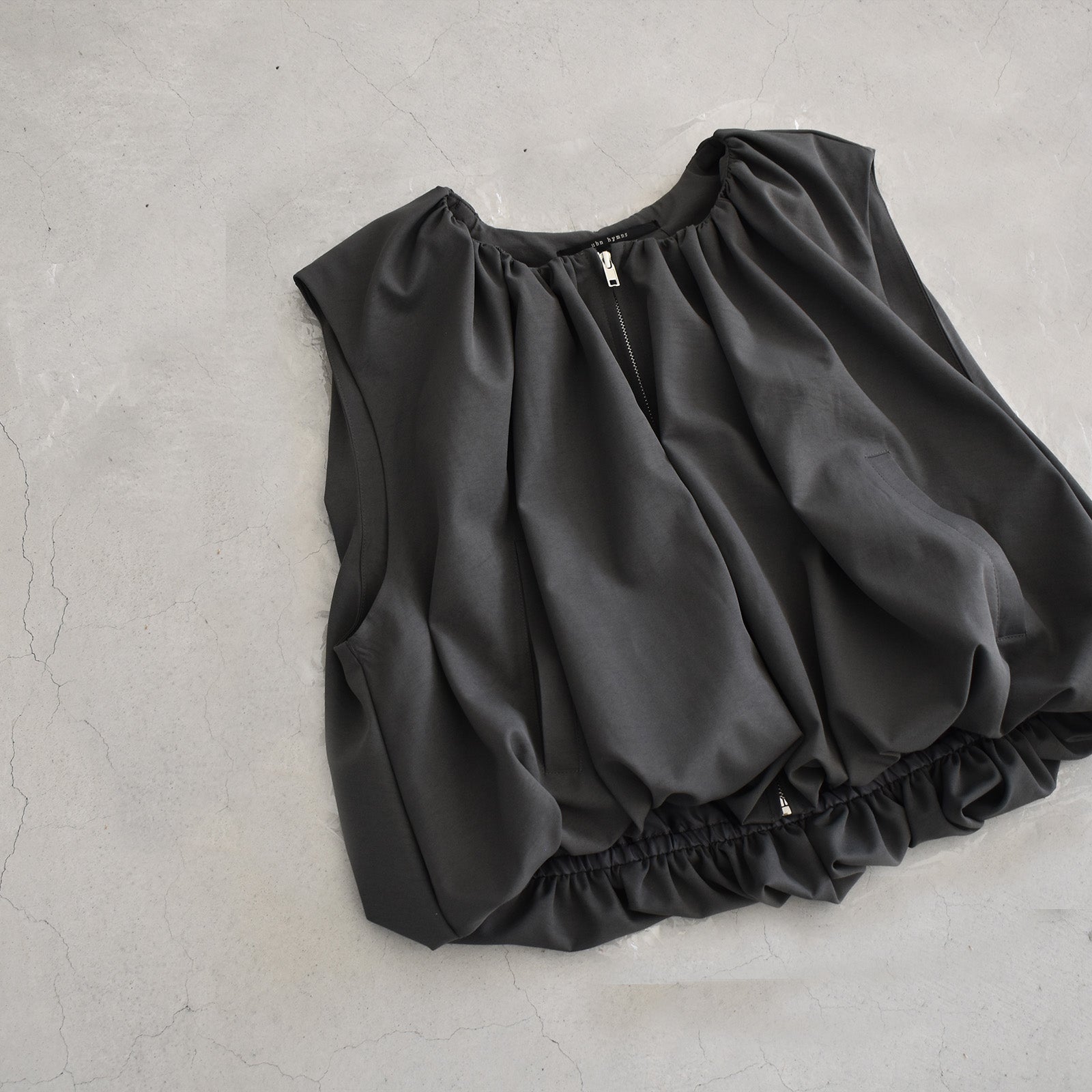 首元にギャザーを施し、裾にかけてふんわりと立体感が出るシルエットのベスト。